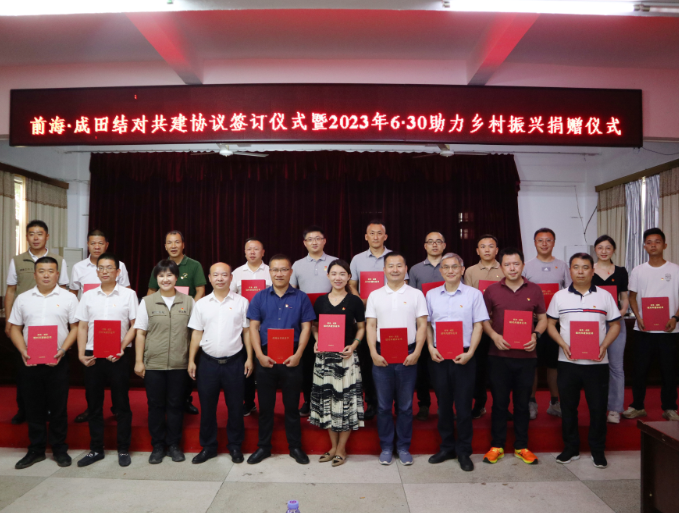 實(shí)地調(diào)研結(jié)束后,相關(guān)單位在鎮(zhèn)政府舉行了“前?!こ商锝Y(jié)對(duì)共建”協(xié)議簽訂儀式暨“2023年‘6·30’助力鄉(xiāng)村振興”捐贈(zèng)儀式。儀式現(xiàn)場,前海管理局向成田鎮(zhèn)政府捐贈(zèng)了2023年“6·30”助力鄉(xiāng)村振興籌集資金共147251元;華潤深圳醫(yī)藥黨支部發(fā)動(dòng)內(nèi)部基層黨員捐贈(zèng)了一批書籍和藥品。