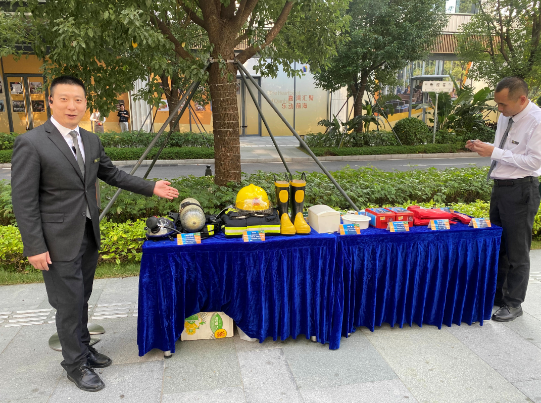 本次消防演練除了疏散實操外,還請消防專業(yè)人員為大家實操各類消防設施設備的正確操作,如正確佩戴防毒面罩,干粉滅火器的操作演示。
