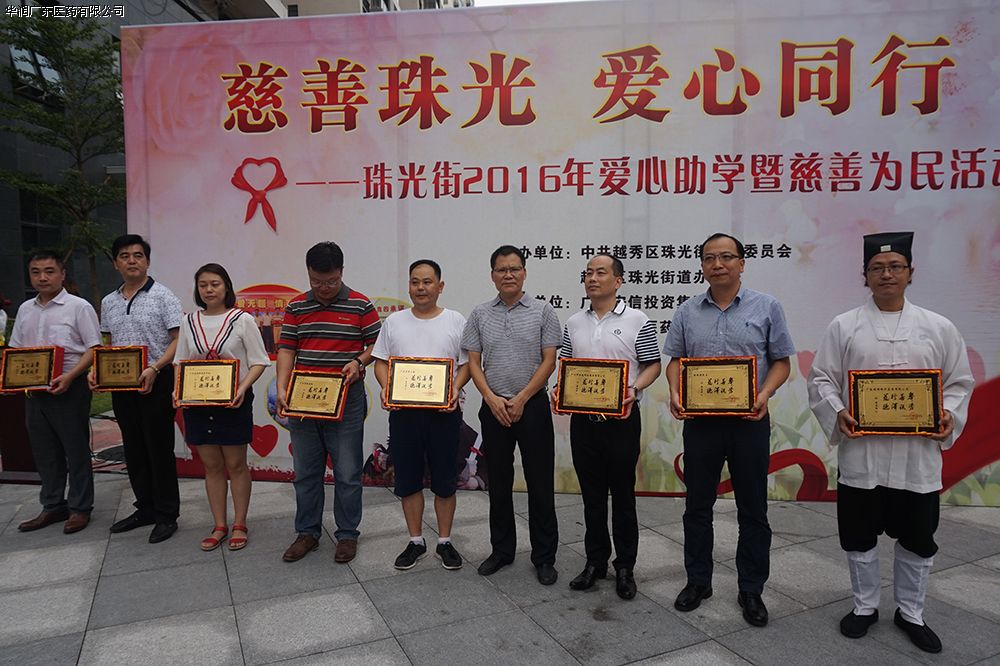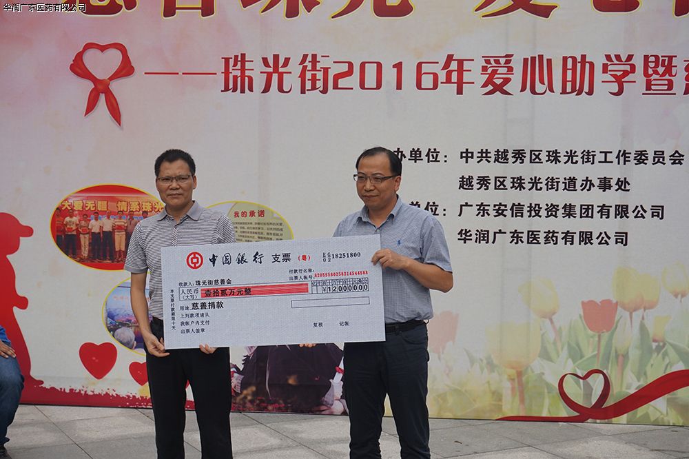 2016年8月23日,由中共越秀區(qū)珠光街工作委員會、越秀區(qū)珠光街辦事處主辦,華潤廣東醫(yī)藥有限公司、廣東安信投資集團(tuán)有限公司協(xié)辦的《慈善珠光 愛心同行——珠光街2016年愛心助學(xué)暨慈善為民活動》,在越秀區(qū)仰忠廣場舉行。華潤廣東醫(yī)藥有限公司黃揚(yáng)文高級副總經(jīng)理出席了本次活動,并代表公司將陳威廉副董事長提供的愛心助學(xué)基金贈與珠光街慈善基金,該基金將為珠江街近30位低收入、低保等困難家庭的大中專學(xué)生提供學(xué)業(yè)資助。