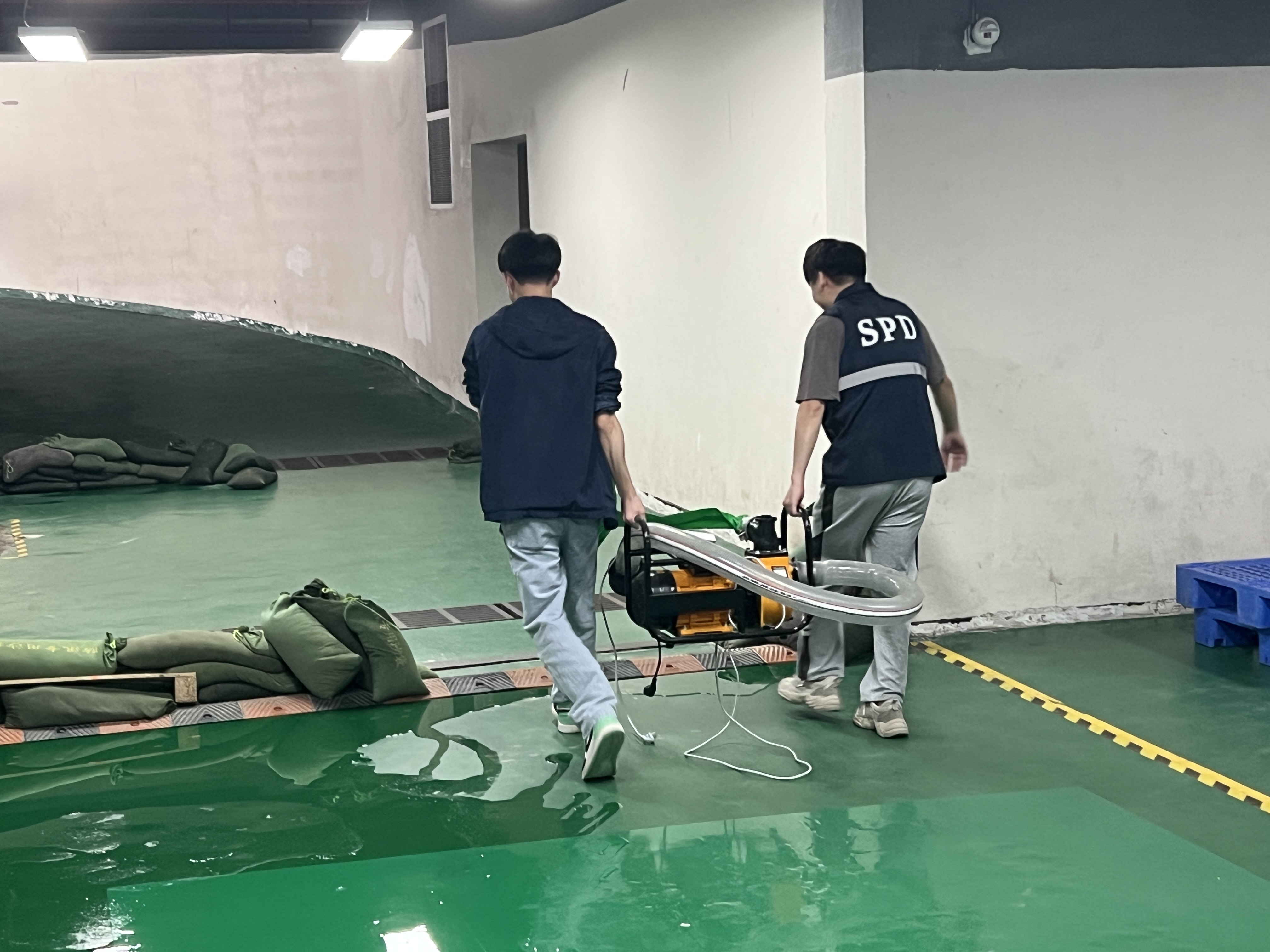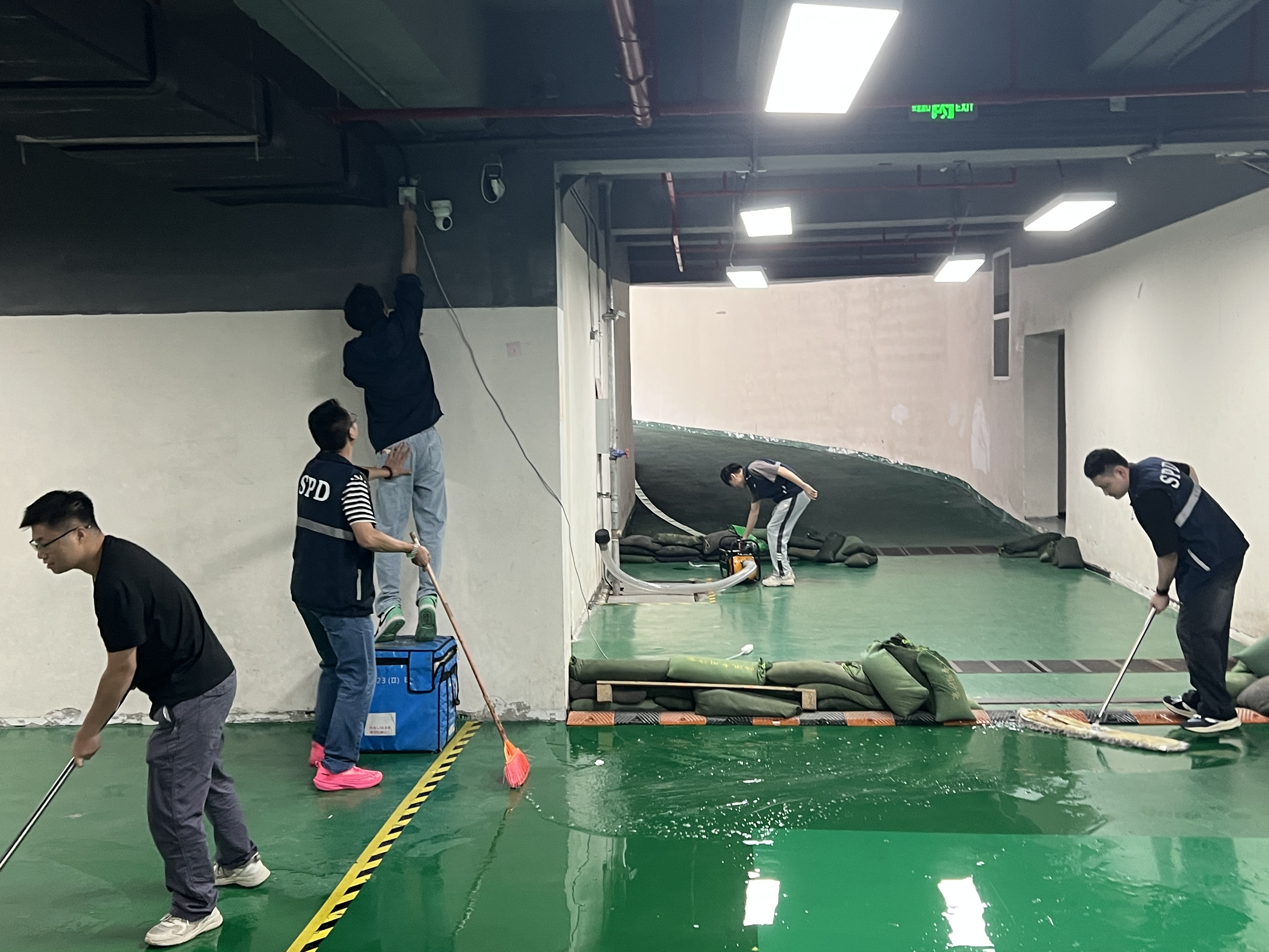 應急小組迅速響應,搶險救援組快速抵達現(xiàn)場,將被積水威脅的貨物轉移至安全區(qū)域,并組織人員堆砌沙包、清理積水,并妥善處置破損物品;警戒疏散組迅速將防洪閘推至預定位置,對倉庫門口區(qū)域警戒,檢查并準備好水泵,引導模擬無關人員有序撤離,維持警戒區(qū)域治安;后勤保障組確認水淹區(qū)域電源情況,進行斷電或恢復供電操作,同時向各小組發(fā)放充足的防洪防汛工具及物資,并與醫(yī)院取得聯(lián)系,記錄溝通結果。最終當現(xiàn)場積水清理完畢,貨物安全轉移,演練圓滿結束。
