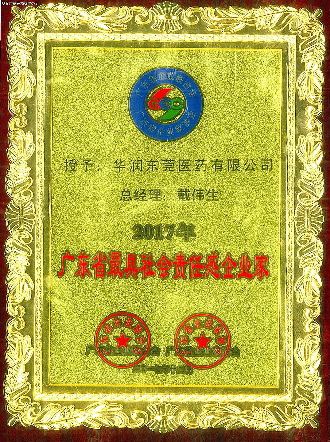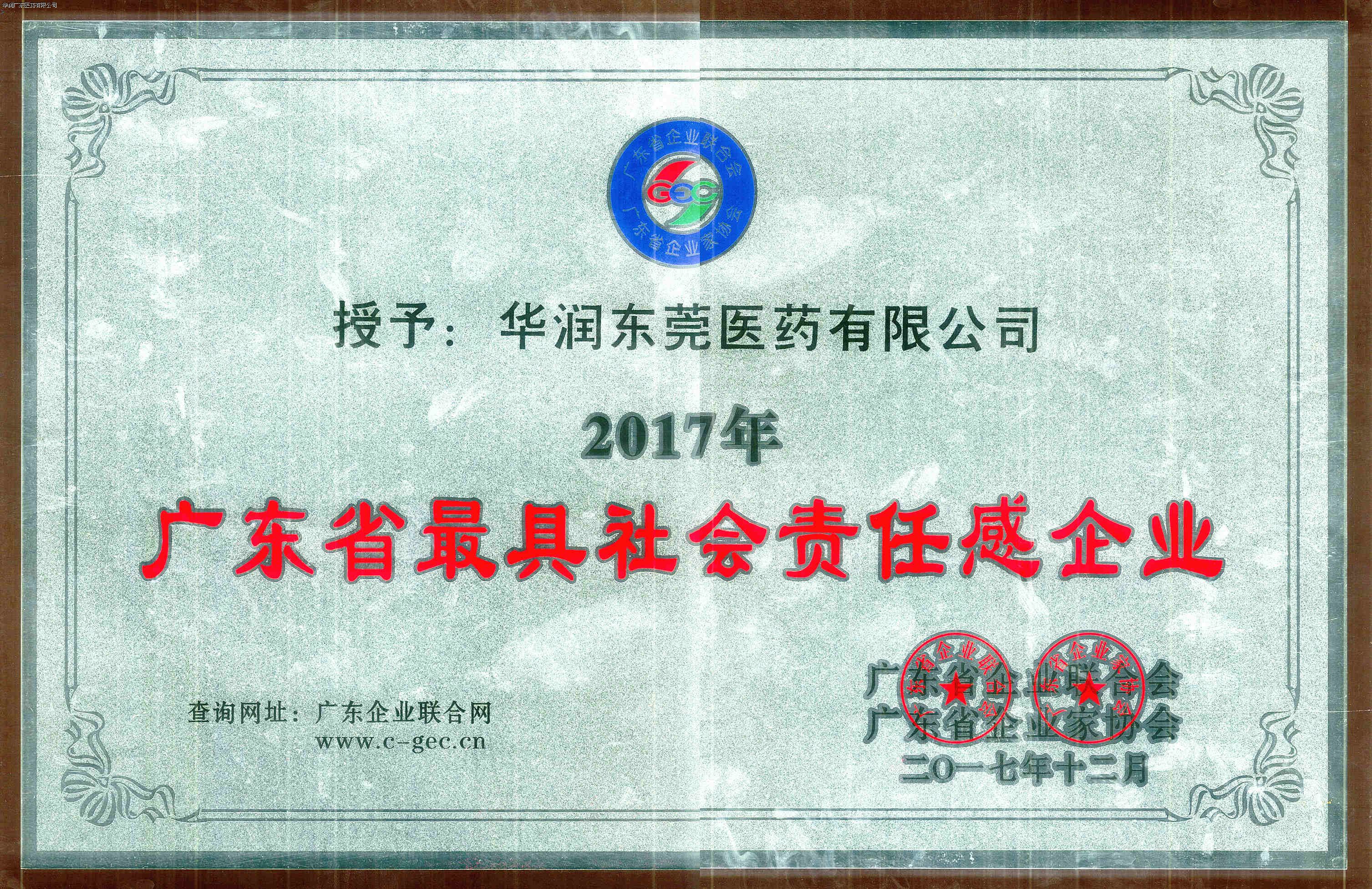 華潤(rùn)東莞醫(yī)藥有限公司榮獲“2017年廣東省最具社會(huì)責(zé)任感企業(yè)”稱號(hào)