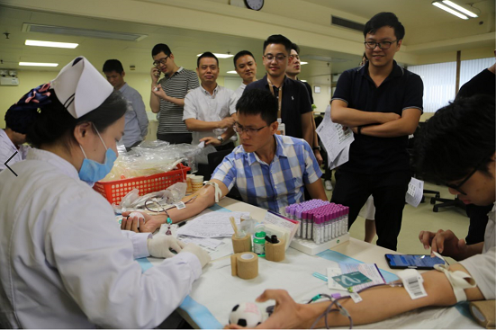 當(dāng)天上午,廣州血液中心的醫(yī)務(wù)人員提前攜帶設(shè)備和物資到達(dá)公司,為即將開始的獻(xiàn)血活動(dòng)做好準(zhǔn)備工作。上午9點(diǎn),隨著同事們的陸續(xù)到來,獻(xiàn)血活動(dòng)正式拉開帷幕。第一位進(jìn)行獻(xiàn)血的是一位女士。在第一個(gè)采血點(diǎn),她配合醫(yī)師進(jìn)行信息登記和健康情況的征詢,然后接受取微量血進(jìn)行血液檢測。接著稍作休息,等候結(jié)果。通過血液檢測后,她便到第二個(gè)采血點(diǎn)進(jìn)行正式的血液采集。第一位獻(xiàn)血者全程從容不迫,仔細(xì)觀察還帶著淡淡的微笑。在她之后,同事們也紛紛有序地參與到活動(dòng)中去。獻(xiàn)血活動(dòng)的主力軍,依舊是意氣風(fēng)發(fā)的青年同志們。友愛與信任在他們的互相鼓勵(lì)之中凝聚,無私奉獻(xiàn)的愛透過他們的實(shí)際行動(dòng)去傳播,而責(zé)任感與擔(dān)當(dāng)也在他們之間繼續(xù)傳承著。
