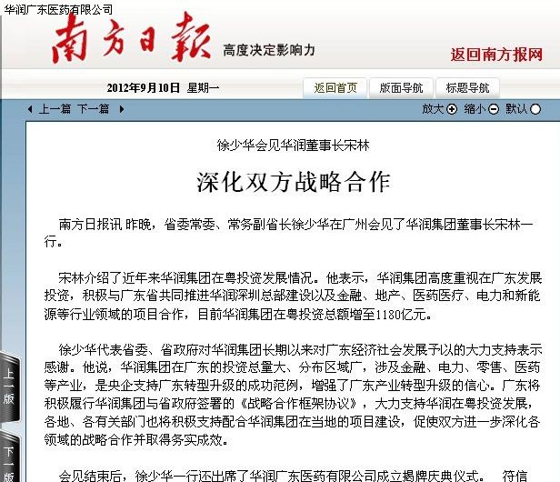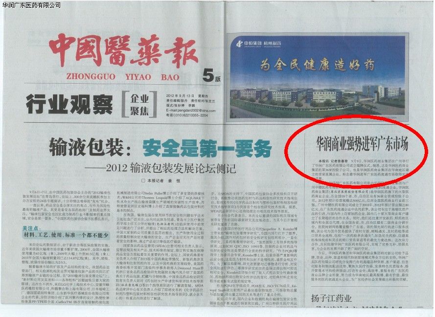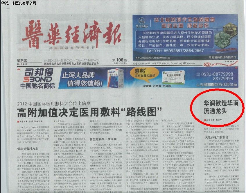 2012年9月9日,華潤醫(yī)藥商業(yè)集團、廣東中健醫(yī)藥有限公司合作成功暨華潤廣東醫(yī)藥有限公司成立揭牌慶典在廣州萬達希爾頓隆重舉行。本次活動受到了華潤集團的重視和廣東省政府的關注與支持,廣東衛(wèi)視、中國醫(yī)藥報、醫(yī)藥經(jīng)濟報、南方日報、廣州日報、羊城晚報等知名媒體前來慶賀并報道了本次慶典。