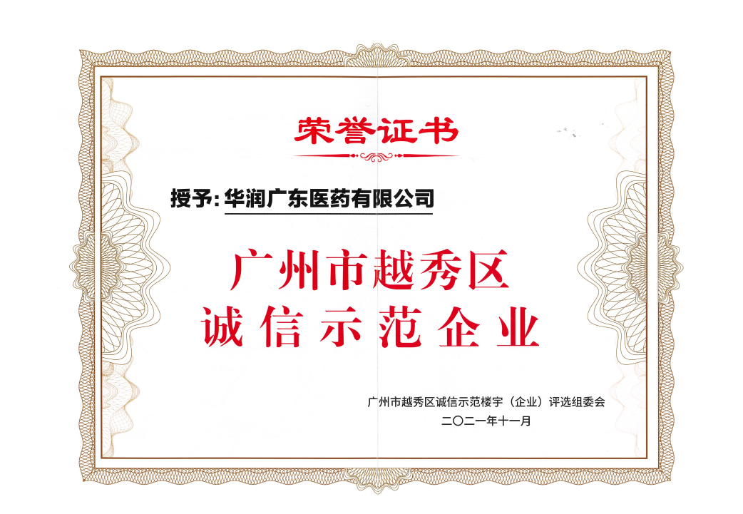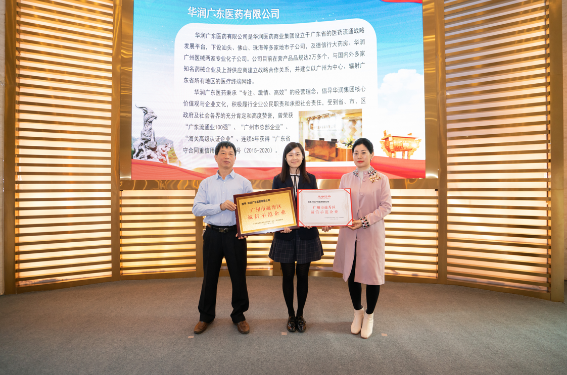2021年11月25日,廣州市越秀區(qū)2021年度“誠(chéng)信示范企業(yè)”及“誠(chéng)信示范樓宇”授牌儀式在珠江國(guó)際大廈隆重舉行。廣州市信用辦、越秀區(qū)信用辦、越秀區(qū)商務(wù)局、越秀區(qū)市場(chǎng)監(jiān)督局、廣東省信用協(xié)會(huì)等單位領(lǐng)導(dǎo)分別為獲批企業(yè)和樓宇頒發(fā)牌匾和證書(shū)。華潤(rùn)廣東醫(yī)藥有限公司(以下簡(jiǎn)稱:華潤(rùn)廣東醫(yī)藥)榮獲“廣州市越秀區(qū)誠(chéng)信示范企業(yè)”榮譽(yù)。